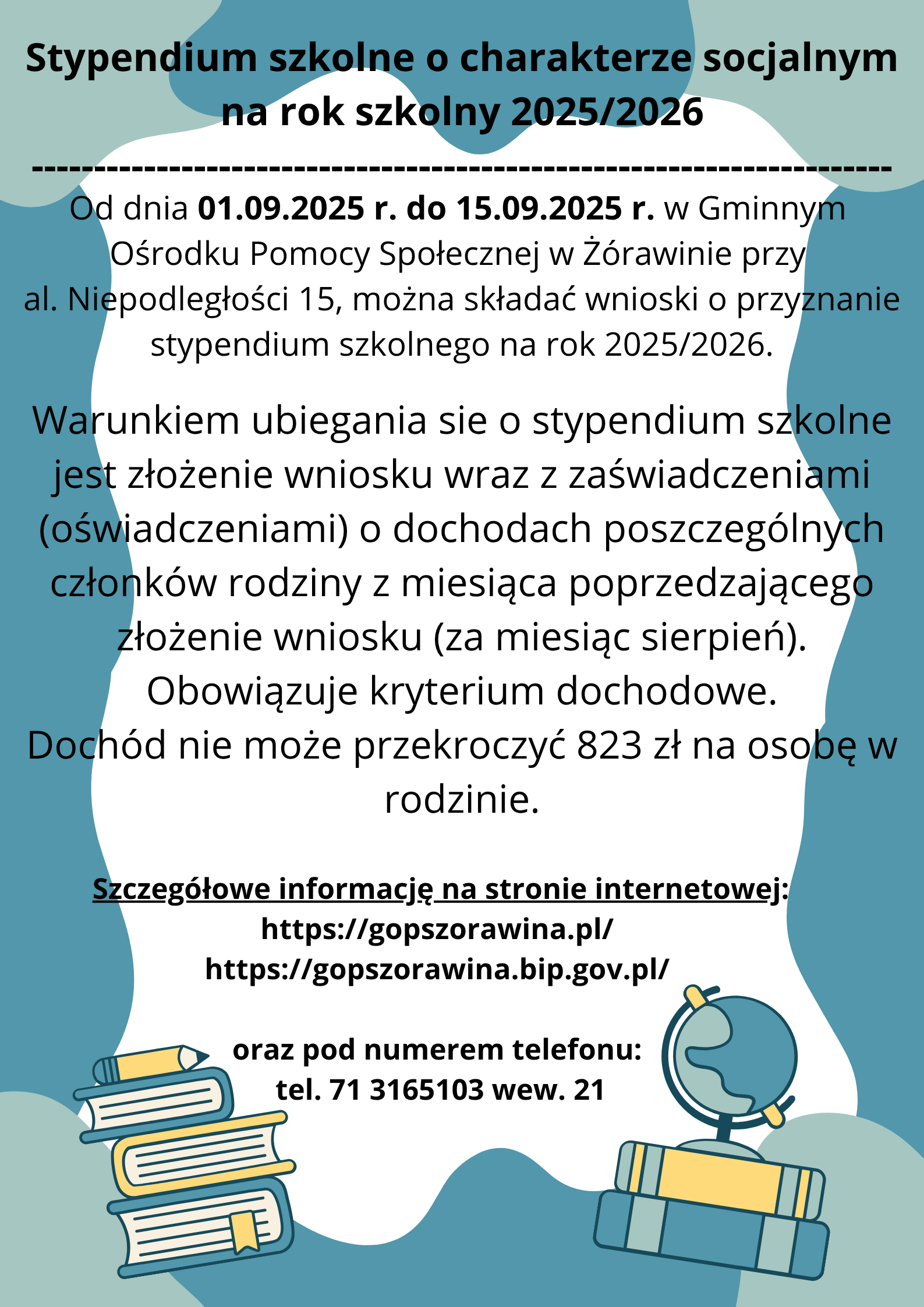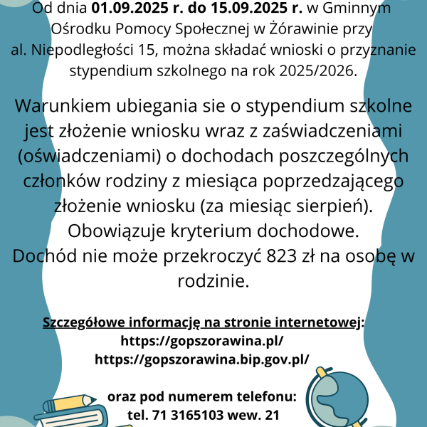 Od dnia 01.09.2025 r. do 15.09.2025 r. w Gminnym Ośrodku Pomocy Społecznej w Żórawinie przy al. Niepodległości 15, można składać wnioski o przyznanie stypendium szkolnego na rok 2025/2026.